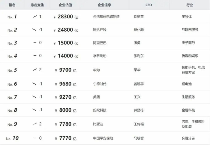 全球半导体制造龙头台积电夺得冠军,成为“黑马”。而宁德时代、比亚迪等新能源汽车“大鳄”分别排在第6、第9,超越金融业巨头中国平安保险,打败拼多多、京东集团等知名电商平台,可见资本对实体经济的重视日益加深。