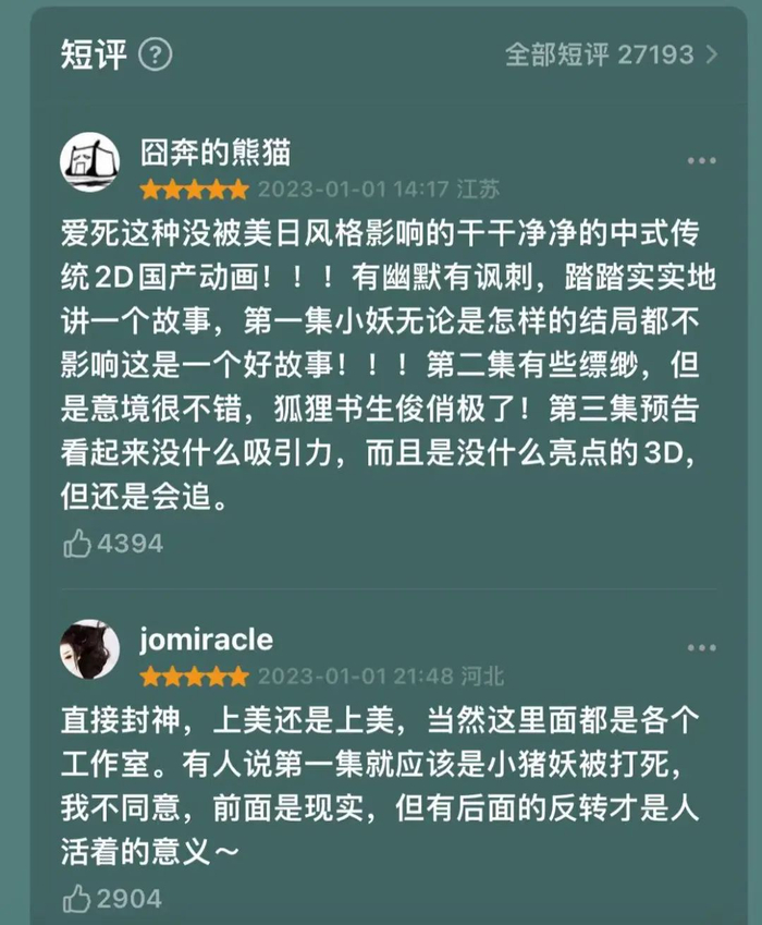 除了第一季《小妖怪的夏天》,整个《中国奇谭》系列由八个植根于中国传统文化的独立的故事组成,主题与中国传统哲学思想密切相关,具有独属于中国的想象力和浪漫哲学。截至目前,《中国奇谭》在B站的播放量已经超过8000万,豆瓣评分9.4,堪称“封神”。但在社交媒体时代,每一部“现象级”的作品的上线并不是终点,上线后的大众反馈往往会成为作品的一部分共同编织它的“意义之网”。