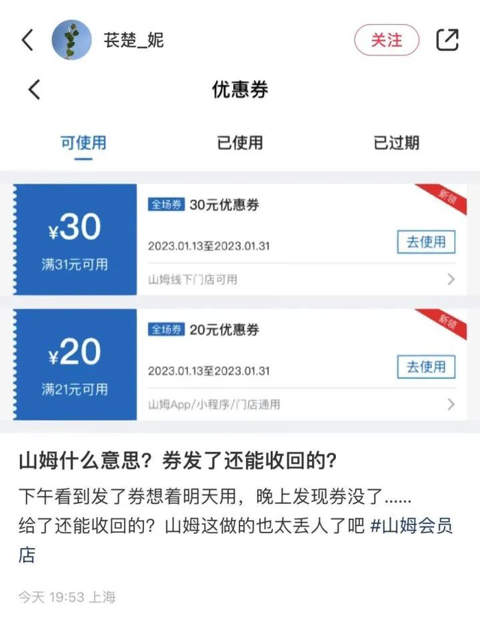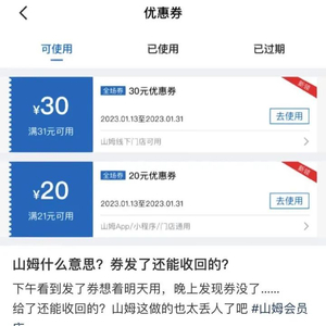 到手的优惠券,还没来得及用,就“消失”了?昨天,有不少网友在社交平台吐槽,下午收到山姆会员商店派送的优惠券,本来想第二天去用,结果晚上发现券没了!