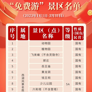 1月1日到3月31日,杭州市对国有A级景区和部分非国有A级景区实行首道门票免费游。包括西湖景区、西溪湿地、良渚遗址公园、千岛湖、大明山、天目山、黄公望隐居地、瑶琳仙境、七里扬帆等41个景区景点。