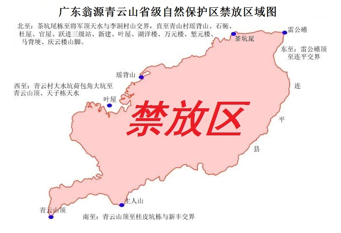 3.龙仙镇青云山区域。青云森林公园:东至天子栋,南至狗爬礤顶,西至大塘坑水库,北至大脑栋。青云山省级自然保护区:东至雷公礤(连平交界),南至主人山,西至天子栋天水,北至茶坑尾。