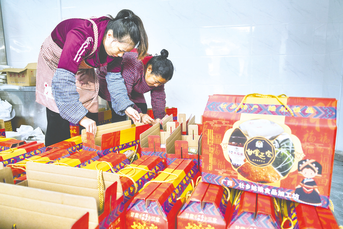 在位于甘棠镇食品产业园内的广西煌尚龙食品科技有限公司,总经理覃妮正和工人一起对当天发往广东等地的50份“甘棠三宝”分装打包,“每年春节前的1个月是公司最忙、订单最多的时候。为了保证口感,我们坚持现做现卖,确保客户吃到最纯正的家乡味。”