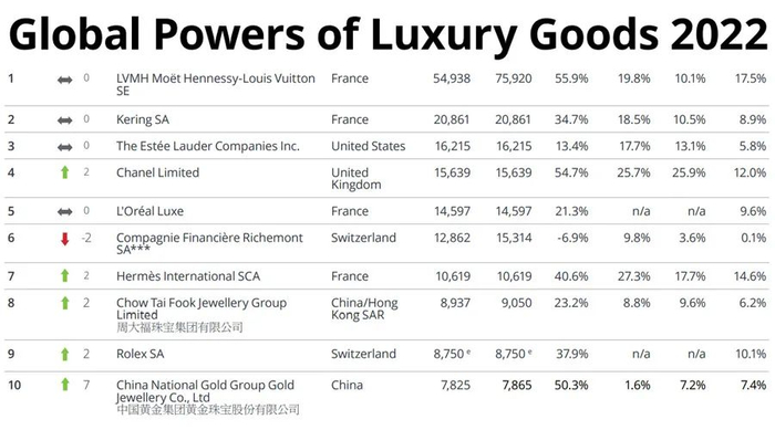 2022年度全球100大奢侈品公司排行榜