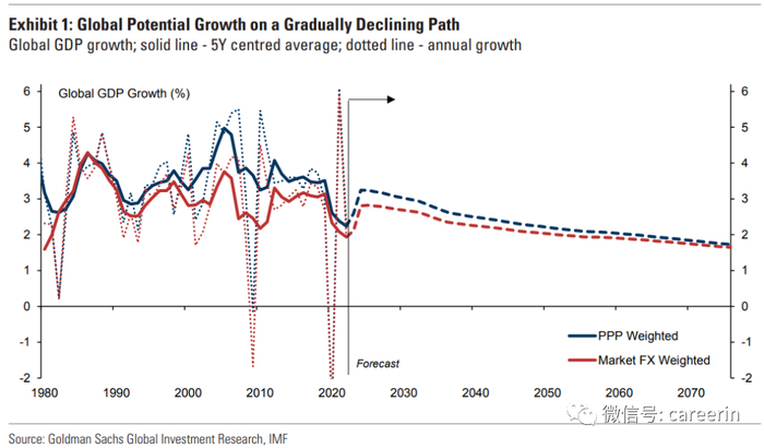 世界经济增长已从全球金融危机前十年的年均3.6%,放缓至新冠肺炎大流行前十年的年均3.2%。高盛的预测表明,未来10年,全球经济增速将略低于年均3%,此后将逐渐下降。经济放缓将对发达经济体和新兴经济体均产生相对广泛的影响,这主要反映了劳动力增长放缓对经济增速的影响。在过去50年里,全球人口增速减半,从每年2%下降到目前不足1%,预计到2075年,全球人口增速将降至接近零。