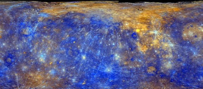 水星表面的假彩色图像,由信使号拍摄的照片拼接制作而成