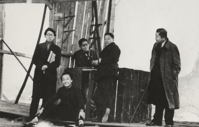 《丁聪在重庆时与友人的合影》(左起特伟、张仃,丁聪、胡考、张光宇) 摄影 1940年代 由丁聪美术馆惠允