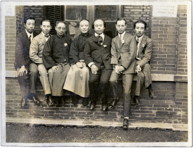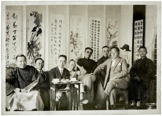 天马会合影 丁悚家藏 ,左起:张辰伯、杨清磬、丁悚、唐吉生、王济远、汪亚尘、江小鹣