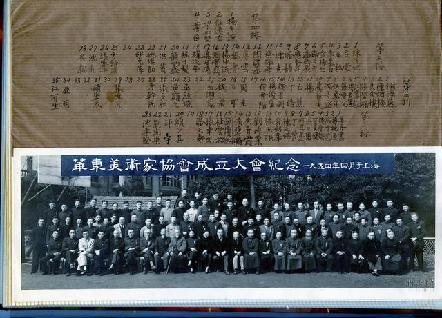 1954年华东区美术家协会成立会员合影,其上对照名单为丁聪1960年代回忆所注。