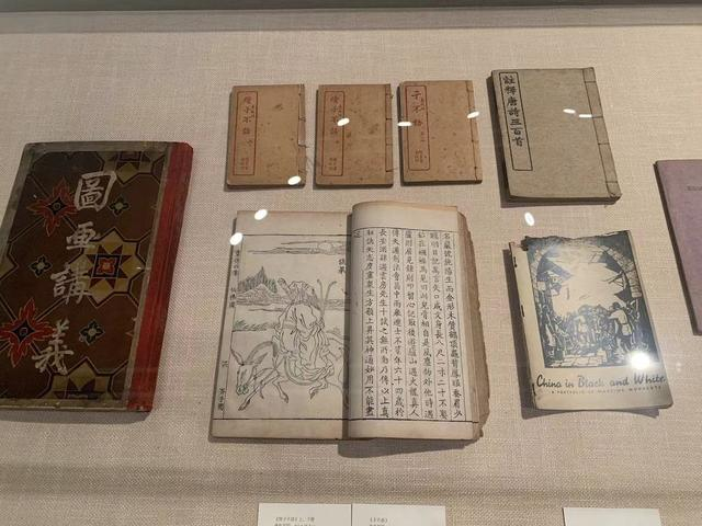 丁悚家藏的部分书籍,其中包括《周湘讲义》1910-1911年(左一),《芥子园画传四集卷》之二(中间打开)