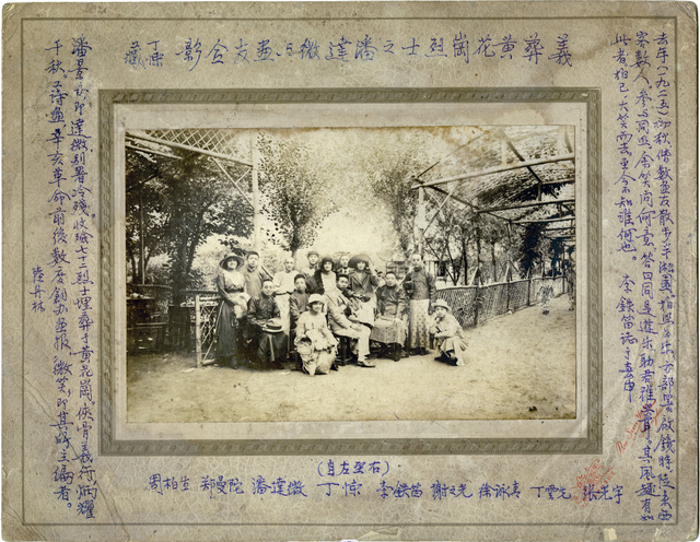 用环像摄影机拍摄的华社社友合影 钱景华摄影 1928年 丁悚家藏; 左起:郎静山、佚名、黄振玉、张光宇、蔡仁抱、佚名、胡伯翔、祁佛青、郎静山、陈冷血、佚名、环像摄影机主人钱景华、黄伯惠、黄振玉、丁悚、张光宇