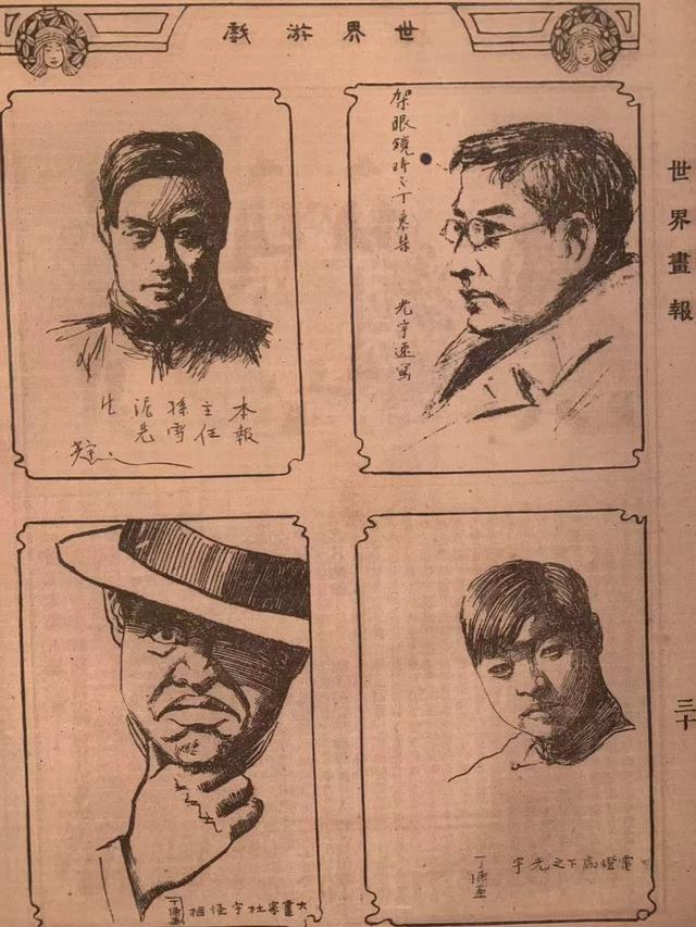 《世界画报》刊载的张光宇画的孙雪泥、丁悚(上)和丁悚画的但杜宇、张光宇(下)