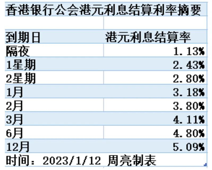 根据香港银行公会1月12日数据显示,1年期港元利息结算利率为5.09%,3个月和6个月利息结算利率为4.11%和4.8%。而在2022年12月15日,1年期的港元利息结算利率更是达到5.78%。