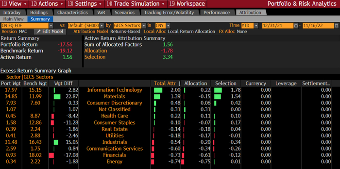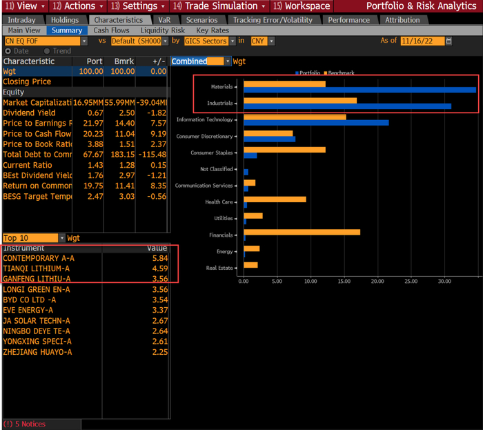 通过穿透持仓功能,FOF组合相比中证800超配基础材料和工业两个板块,其中10只基金穿透后重仓股前三名分别为宁德时代、天齐锂业和赣锋锂业。信息技术和基础材料板块对收益贡献最多。