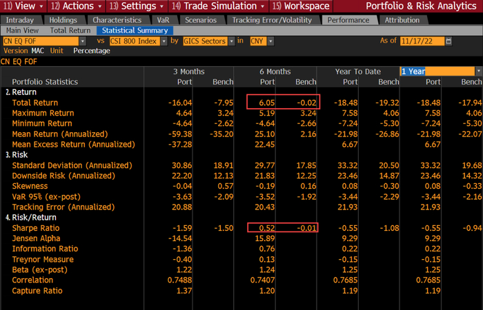 如选用中证800作为业绩基准,在2022年五月之后,该FOF组合业绩超越基准,产生1.56%超额收益。通过总览界面看到该产品在一年内,近期六个月表现最佳,夏普比优于其他期间。