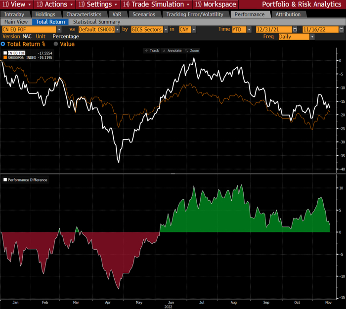白色线为自主创建的FoF, 黄色线为基准。绿色代表超额的累计表现,红色代表低于基准的累计表现。