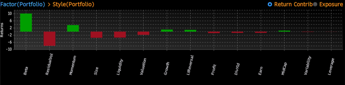 2.在风格因子方面(总收益口径。另外可以提供总风险敞口分析):Beta和动量因子贡献正向收益前两位。