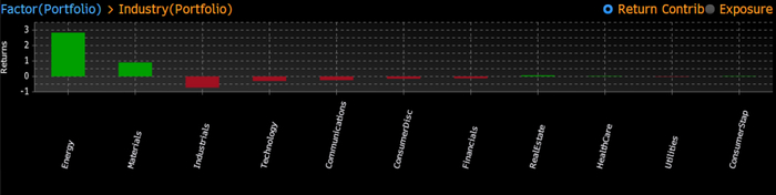1.在行业因子方面(总收益口径。另外可以提供总风险敞口分析):能源和基础材料业贡献总回报为前两位。