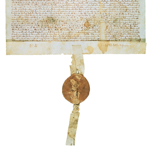 值得一提的是,英王的大御印是典型的西方旧式印章,其使用之基本原理与中国古代帝王的御玺十分类似,但此器物的制作和具体使用之技巧却有独特性。从形态上讲,大御印本身是个金属模具(matrix),呈圆形盒子之形状,加盖时会将熔化的蜡和一根连接文书的绳带放入模具中,待蜡凝固后便形成蜡状大御印,悬挂在文件之下。其具体形态可参考下图,此系上文提及的加盖有大御印的1297年版大宪章。