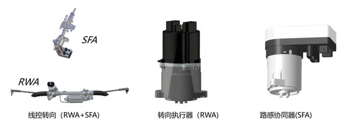 该公司的线控转向组件包括:转向执行器(RWA-Road wheel Actuator)与路感协同执行器(SFA-Steer Feeling Actuator)2部分关键功率组件。目前该组件正在多款配备线控底盘的实车上进行标定验证,根据试验验证进度,最快将于今年5月进入小批量试制阶段。