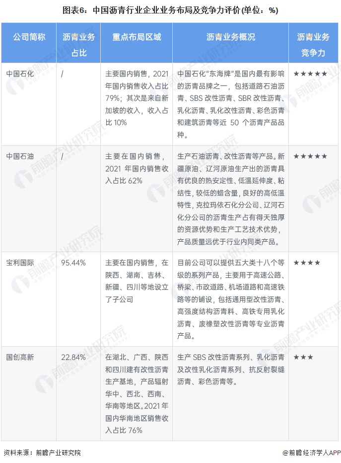 从企业沥青业务的竞争力来看,中国石油、中国石化对于上游原油的控制力较强,规模优势、品牌优势大,综合竞争力排名较强。