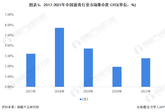 综上所述,我国大型国有企业沥青产品品牌影响力较高,其他中小型企业数量多且规模小,对比发达国家成熟市场,行业集中度不高,核心竞争力不强。2021年,我国沥青行业CR3为2.78%。