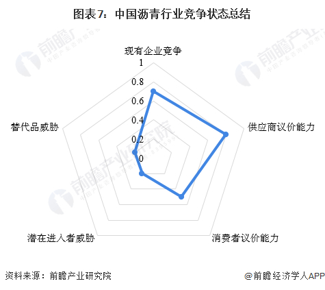 从五力竞争模型角度分析,因沥青上游产品原油受国际油价影响较大,且专业沥青生产商对上游的后向一体化程度较低,因此供应商议价能力较高;沥青种类丰富、专用性较强,但大类产品工艺成熟、标准化程度高,因此下游消费者议价能力高;中石油、中石化等大型国有企业对原材料的控制力度较强,品牌优势明显,因此新进入者威胁较小;沥青产品暂无明显替代品,替代品威胁极小;沥青行业中小企业数量较多,竞争激烈。