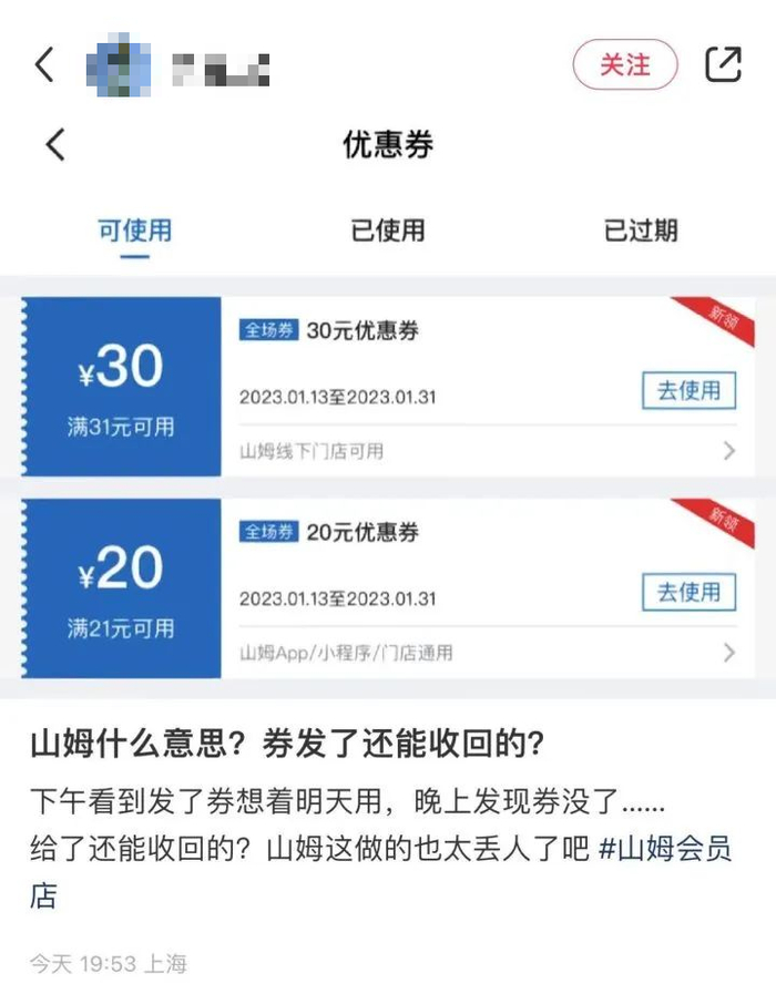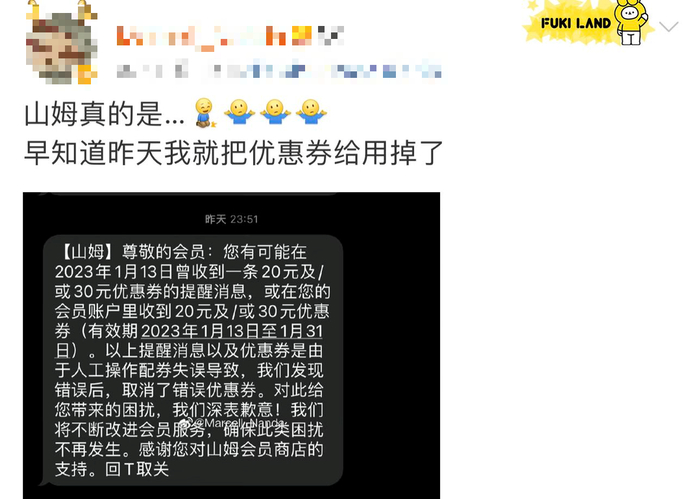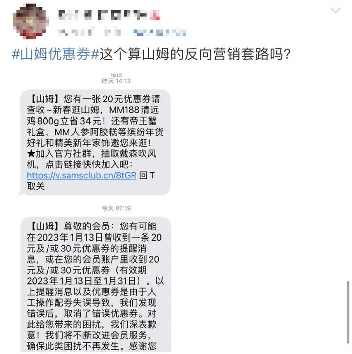 山姆直接取消了未核销的优惠券