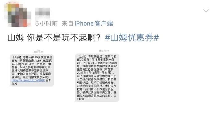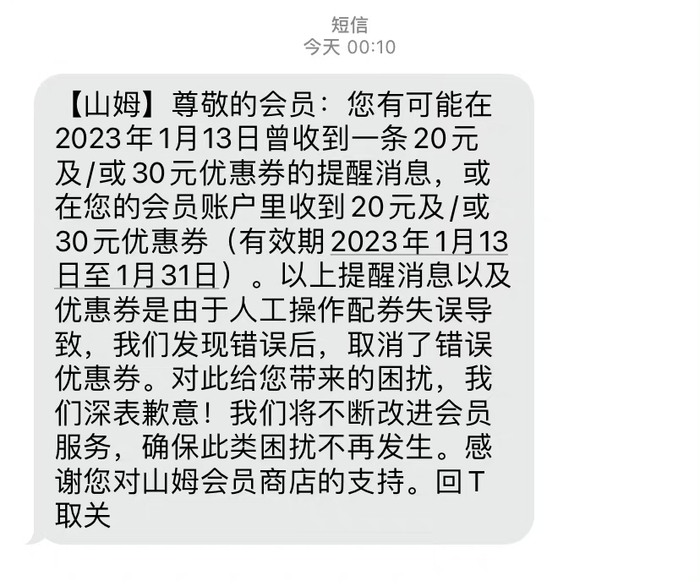深夜收到了山姆的解释短信