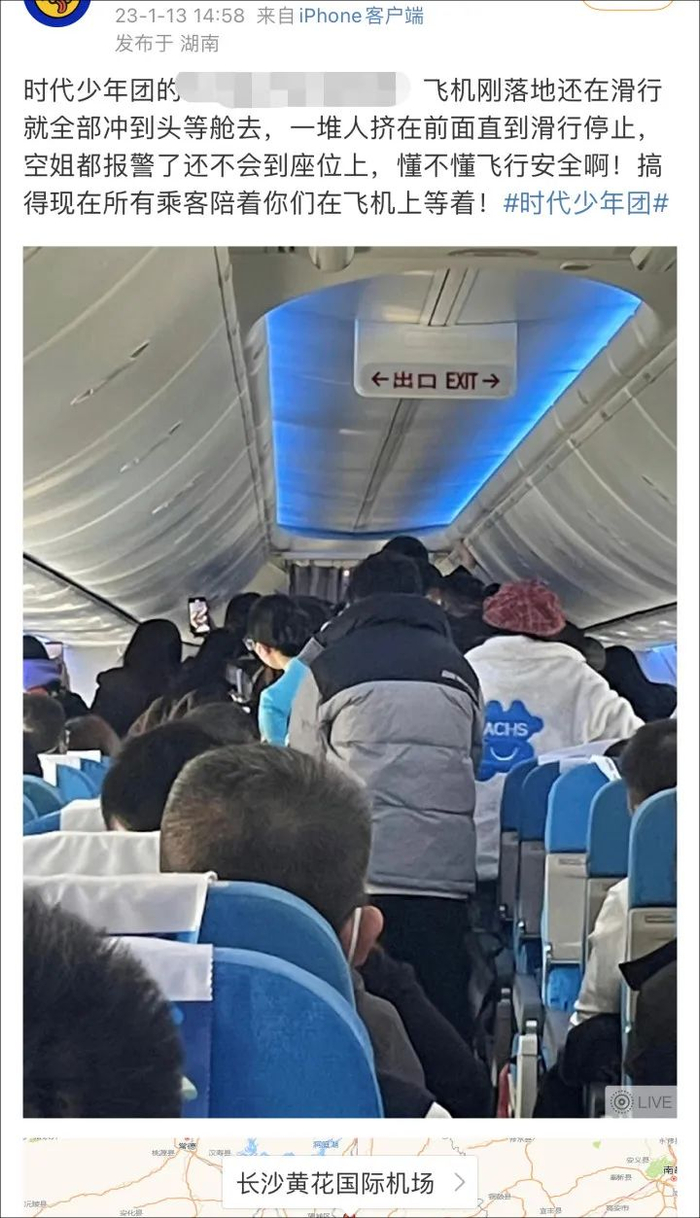 此前,有同机乘客称,飞机刚落地还在滑行时就有粉丝冲到头等舱,挤在前面直到飞机滑行停止,感觉很不安全。
