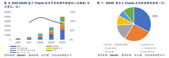 高性能计算需求推动Chiplet市场空间激增,呈现异军突起之势。根据Gartner预测,基于 Chiplet方案的半导体器件收入将在2024年达到505亿美元左右,2020-2024年间CAGR达98%,而用于服务器的器件销售收入为占比最大的应用终端,在2024年达到约为33%。