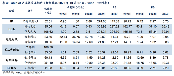 信达证券莫文宇在2022年10月30日发布的研报中表示,随着Chiplet技术生态逐渐成熟,国内厂商通过自重用及自迭代利用技术的多项优势,推动各环节价值重塑。Chiplet产业链分为IP/EDA/先进封装/第三方测试/封测设备/IC载板等部分。