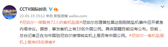 综合外媒报道,当地时间1月15日上午,尼泊尔雪人航空公司一架从加德满都飞往博克拉的客机突发坠机,机上或载有72人,目前已有至少30名遇难者遗体被找到,尚未确认有人生还,搜救正在紧张进行中。