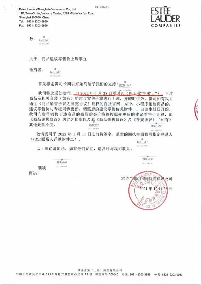 其中一位博主还在小红书上传了一份雅诗兰黛(上海)商贸有限公司关于产品涨价的内部文件。文件显示,自2023年1月29日零时起,《附件一》中商品及相关套装(如有)的建议零售价将进行上调 ,并即时生效。如有通过 《商品销售协议之补充协议》授权的百货官网、APP、小程序销售商品的,建议零售价与专柜同步更新。
