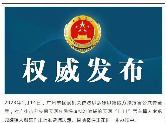 广州市检察院依法以“涉嫌以危险方法危害公共安全罪”,对造成5死13伤的广州宝马撞人案犯罪嫌疑人温某,作出批准逮捕的决定。