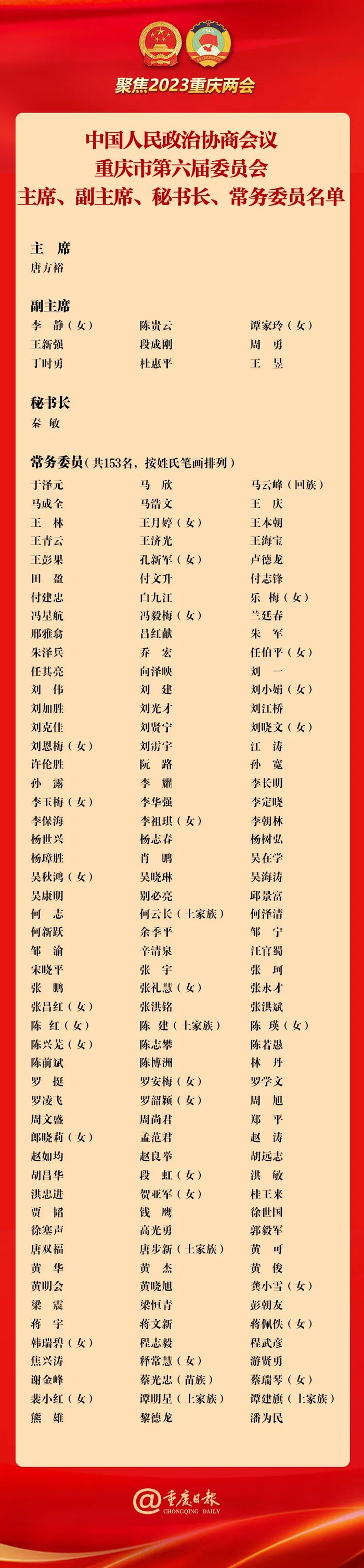 政协重庆市第六届委员会主席、副主席、秘书长、常务委员名单