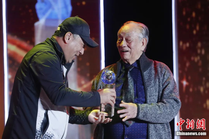“2019全球华侨华人年度评选颁奖典礼”上,中国羽毛球队原总教练李永波为“人民楷模”国家荣誉称号获得者、新中国羽毛球事业的开拓者王文教(右)颁奖。韩海丹 摄