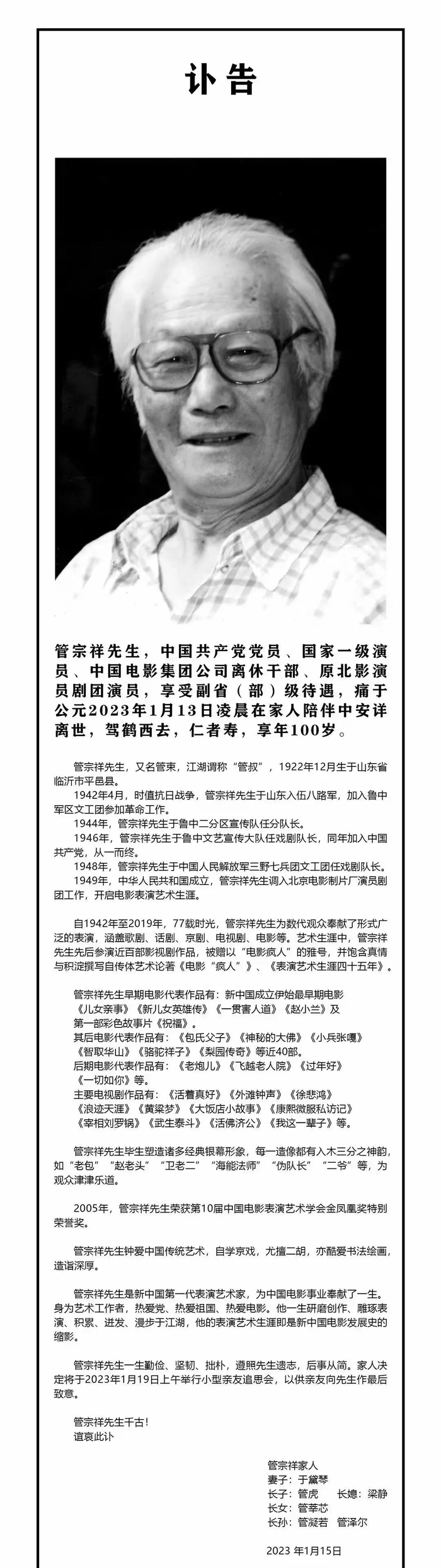 本月13日凌晨,著名表演艺术家管宗祥去世。昨日下午,管宗祥的儿子管虎等家人发出讣告。