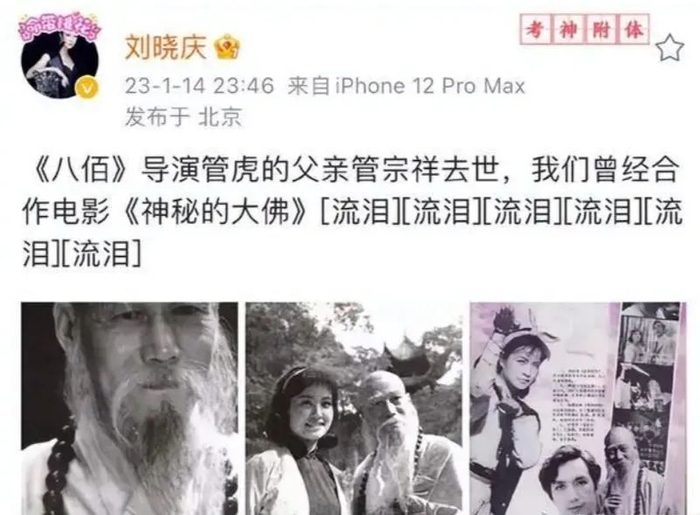 管宗祥去世后, 刘晓庆在社交平台上发出她与管老在《神秘的大佛》中的剧照,表达了对老先生的悼念。