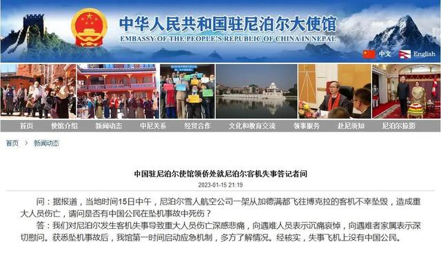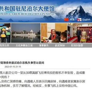 据中国驻尼泊尔大使馆网站消息,1月15日,中国驻尼泊尔使馆领侨处就尼泊尔客机失事答记者问表示,对尼泊尔发生客机失事导致重大人员伤亡深感悲痛,向遇难人员表示沉痛哀悼,向遇难者家属表示深切慰问。