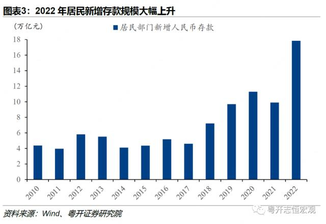 2、2022年居民存款出现了异常增长。一是增速上,当年存款余额同比增长17.4%,创2010年以来新高;二是规模上,全年新增存款17.8万亿,大幅高于2019-2021年同期的9.7、11.3和9.9万亿。若将居民存款的这种异常增长视作“超额存款”,则2022年高达近8万亿元。