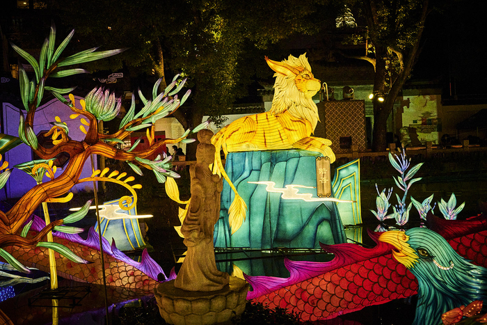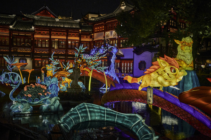 这个周末,流连在豫园老街,头顶“空中龙门”灯组中各种造型元素一齐绽放。登临九曲桥,如同踏入一个浪漫而旖旎的上古奇幻世界,仙雾缥缈之间,九洲灜海,奇花异草,《山海经》中耳熟能详的瑞兽,逐一从书卷图鉴之中奔现,与人们邂逅:应龙有翼,一飞冲天,此刻,它正神气地盘踞在湖面上,守护着九曲仙境。从湖心亭漫步而过,只见灵瑞白鹿乍现,神奇的鹿角格外吸睛。徜徉在九曲桥上,时不时就会有激萌瑞兽欢跃而来,驺吾垂钓,当康突进,文鳐夜飞,陆吾摆尾,堪比国风版的《神奇动物在哪里》。