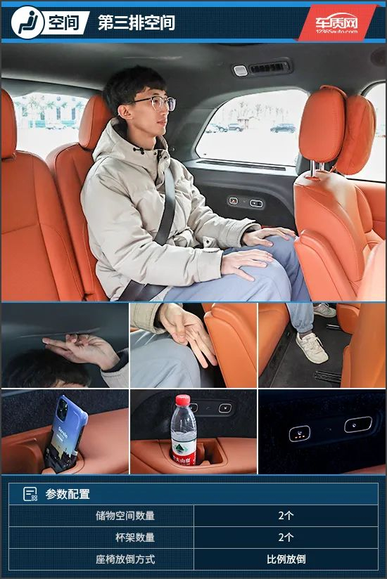 体验者来到第三排,头部空间两指,腿部空间三指,乘坐空间虽谈不上充裕,但短时间乘坐还是可以接受的,并不算鸡肋。同时,理想L9还为第三排乘客提供了可三档调节的座椅加热和第二排座椅调节,比较罕见。储物空间方面,左/右两侧饰板分别设置了杯架和储物槽,确保了实用性。
