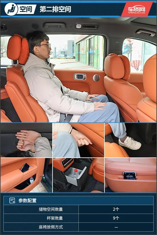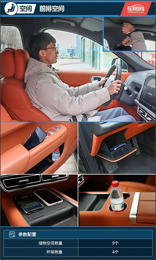 身高178cm的体验者坐进前排,头部空间两拳有余,非常充裕。储物空间方面,储物槽数量较多,前排无线充电板还支持两部手机同时充电,实用性出色。