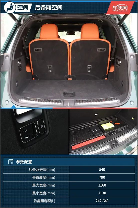 在展开第三排座椅的状态下,后备厢内部非常规整,空间利用率很高。同时,后备厢左侧配有第三排座椅电动折叠和降低底盘高度的物理实体按键,能够带来更为高效与高级的用车体验。此外,地台盖板下方为随车工具,并且预留了储物空间。