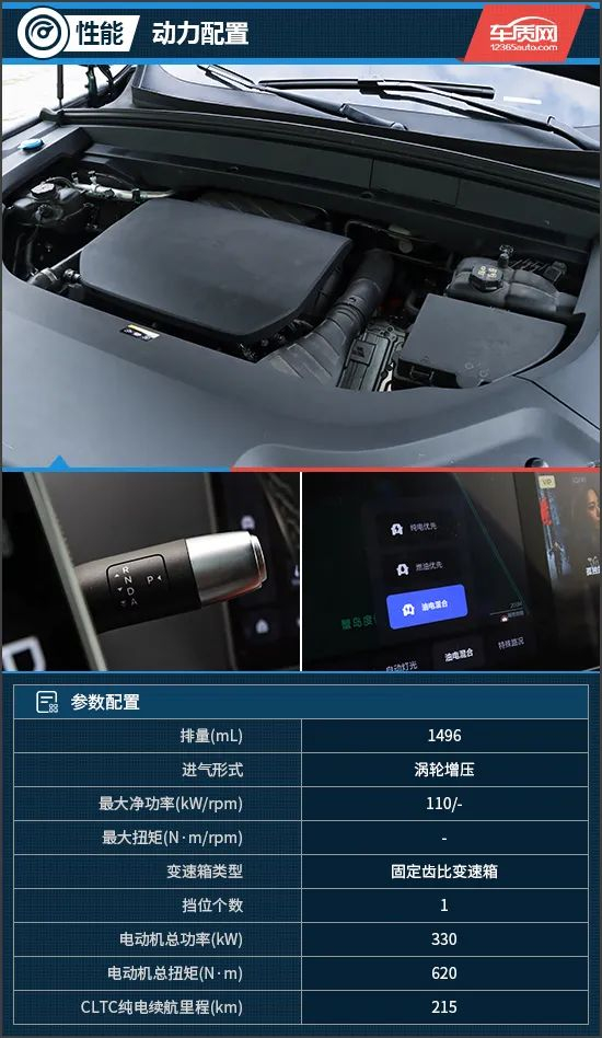 同时,这套增程系统还提供“纯电优先”、“燃油优先”和“油电混合”三种模式,即便选择“燃油优先”,增程器的工作状态也不易察觉,工作噪音被抑制得很小,如果不刻意感受,其实这台车动力系统的工作状态跟纯电动车无异。
