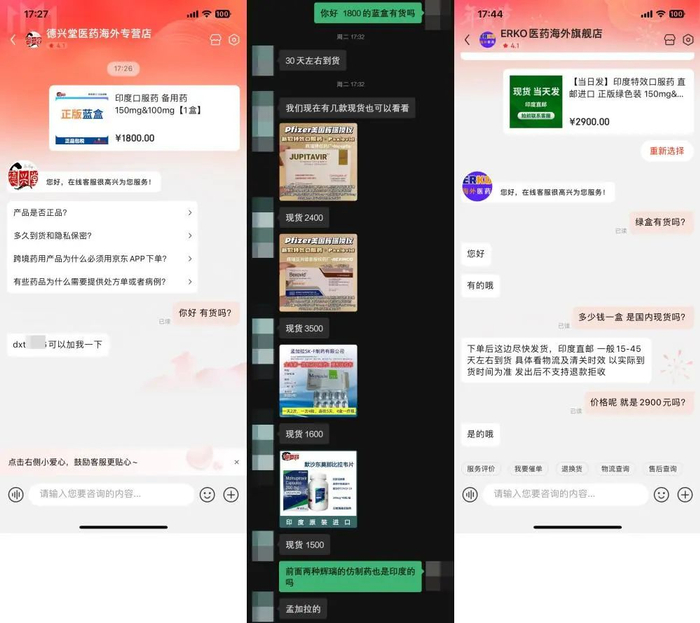 有货吗?1800元销售“正版蓝盒”的商家“德兴堂”告诉记者没有现货,需要等待30天到货。但加了商家微信后,对方推荐了孟加拉国产的另外两款Paxlovid仿制药,售价2400元和3500元一盒,均有“国内现货”;另一商家“ERKO医药海外旗舰店”正在销售2900元的“正版绿盒”,客服称有现货,印度直邮15-45天送达……