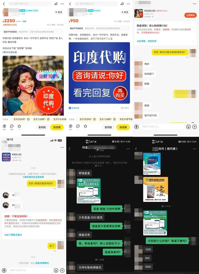 不仅是“京东国际”平台,“闲鱼”平台上大量的“印度代购”们也都在销售新冠仿制药。记者通过“闲鱼”平台,随机联系了两名印度代购,他们都明确告知手上有新冠印度仿制药的现货,不过要聊具体的购买细节必须“移步”微信。加上微信后,两名代购均称他们手上就有蓝盒Paxista现货,开价分别为2600元和2800元。