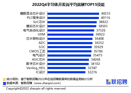 全球科技公司竞争加剧带动企业对于芯片的需求升级。目前国内芯片领域技术短缺,人才也严重短缺,人才缺口巨大,短期内弥补困难,因此芯片技能人才在招聘市场走热,薪资水平随之升高。四季度半导体开发岗中,模数混合芯片设计技能薪酬排名居于首位,平均招聘月薪40233元,SoC芯片、ASIC芯片、模拟芯片设计、芯片架构设计、数字芯片设计等技能的招聘薪酬在3-4万元也大幅领先。