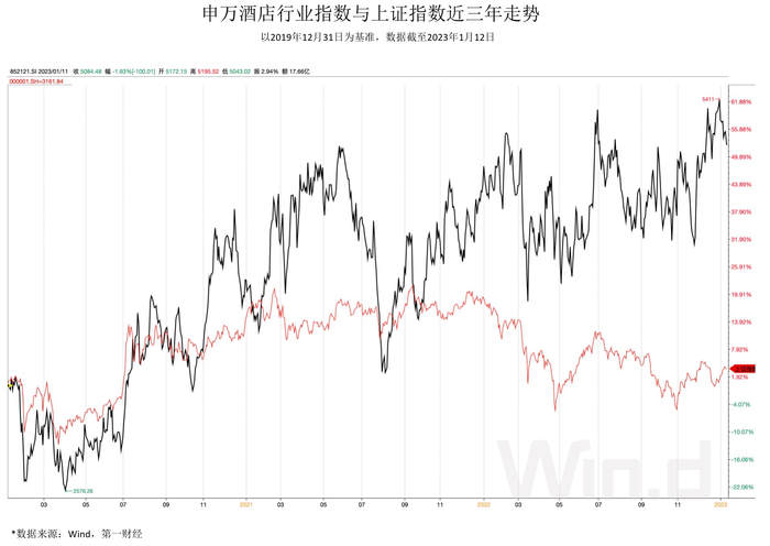 但飘红的财报似乎并没有吓退投资人,酒店行业这3年甚至走出了逆市行情。以申万酒店行业指数为例,根据Wind数据,截至2023年1月13日,较2019年年底涨幅在50%以上,申万酒店行业总市值则从2019年年末的550亿元大幅增长至逾千亿元。