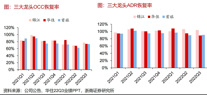 一般而言,酒店行业OCC(入住率)会率先回升,需求回暖提高客房单价,从而带动ADR(平均房价)的提升。但本轮新冠疫情周期中,回顾三大龙头酒店数据,ADR的恢复率要明显好于OCC。